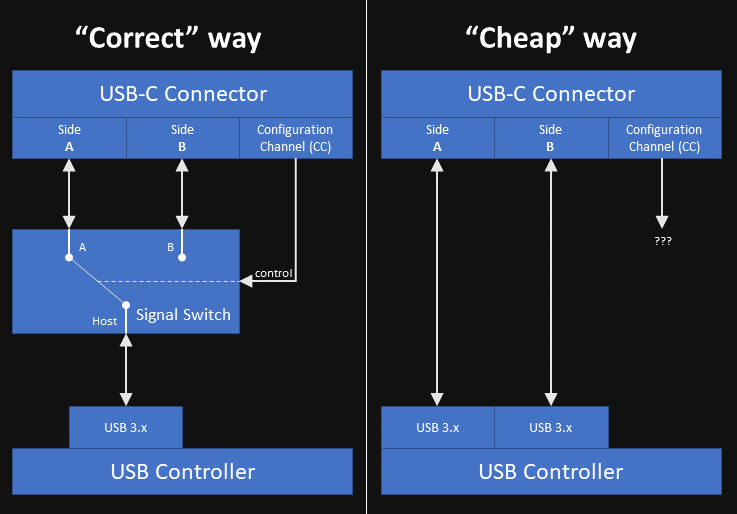 The “correct” way to go about implementing a single-lane USB-C port - outlined in Figure 4-4 as well as the diagram above - is by using a mux, which probes the Configuration Channel (CC) pins to determine the plug’s orientation and activate the correct SuperSpeed lanes on the receptacle. From a consumer electronics manufacturing standpoint of “a penny saved is a penny earned”, such muxes are expensive - let’s look into a few parts specified for USB 3.x Gen1, and how much they cost in quantity at retail (manufacturers obviously pay less than this) as of writing: