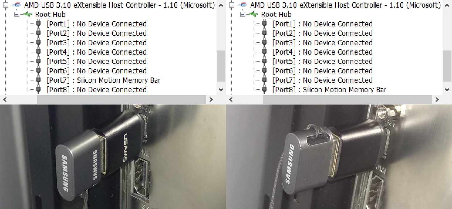 The device I’m using for this test is a Gen1 flash drive attached to an USB-C to USB-A adapter. The picture below shows one orientation results in the flash drive being connected to logical port 7, and another orientation results in it being connected to logical port 8. I’ve also repeated this test with an USB 2.0 flash drive, and it always appears on logical port 3 regardless of the adapter’s orientation, indicating that the D+ and D- pins are commoned across both sides of the connector as allowed by the specification. This USB controller happens to be the one built into the Ryzen CPU, with 4 physical USB 3.x ports3 and therefore 4 logical USB 2.0 ports + 4 logical USB 3.x ports4; if I were to guess, the lower 4 ports displayed in HWiNFO correspond to USB 2.0 and the upper 4 correspond to USB 3.x, which makes port 3 the USB 2.0 counterpart to port 7, leaving port 4 unused.